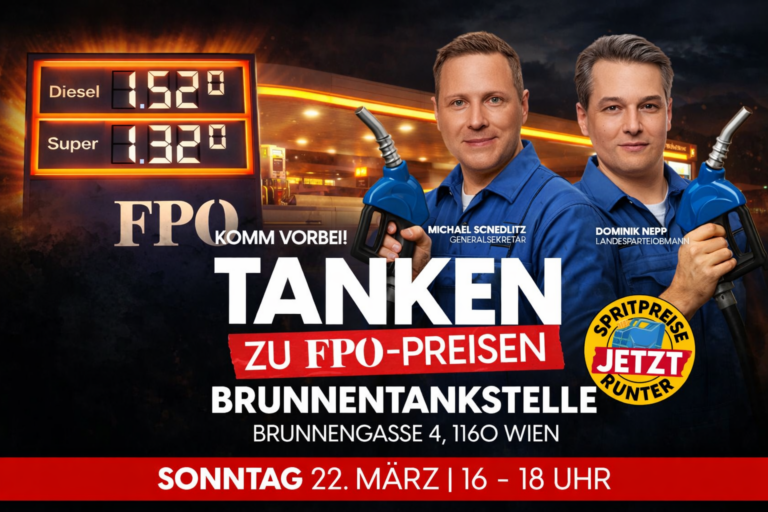 Die Spritpreise explodieren, und während es von der Verlierer-Ampel nur eine Mini-Entlastung gibt, will die FPÖ zeigen, wie billig tanken wirklich geht: Am morgigen Sonntag um 16 Uhr in Wien-Ottakring kann an der der Brunnentankstelle (Brunnengasse 4) Super für nur 1,32 Euro pro Liter und Diesel für 1,52 Euro getankt werden – spürbar günstiger als der aktuelle Marktdurchschnitt.