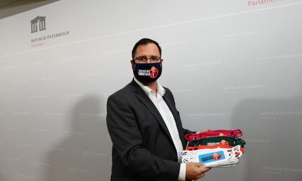 Die FPÖ-Fraktion hat im U-Ausschuss gegen die fortgesetzte “Sobotage” des Untersuchungsgremiums durch den Vorsitzenden Wolfgang Sobotka und gleichzeitig gegen den von ihm für alle Mitarbeiter verhängten Maskenzwang im Parlament protestiert. Abgeordnete, wie Christian Hafenecker, und Mitarbeiter der FPÖ trugen blaue Masken mit der Aufschrift “Schluss mit Sobotage”. Weil es sich natürlich um ein überparteiliches Anliegen handelte, wurden auch den anderen Fraktionen Masken in ihrer Parteifarbe angeboten. Bis auf die ÖVP haben sie auch alle angenommen.