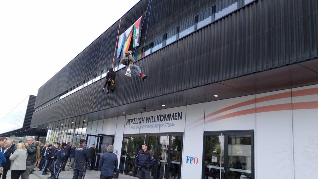 Groß angekündigt waren linke Störaktionen, die allerdings sehr bescheiden ausfielen: Zwei linke Aktivisten seilten sich von der Salzburger Messehalle ab, in der der Parteitag stattfindet. Vor dem Veranstaltungsort demonstrierten unter anderem die altbekannten “Omas gegen Rechts” und einige wenige ihrer Gesinnungsgenossen. Den Delegierten und Pressevertretern konnten die “Antifaschisten” den Weg zum Parteitag allerdings nicht blockieren.