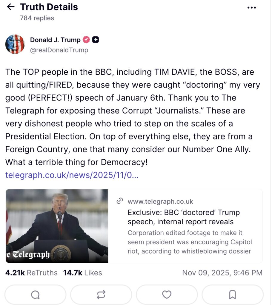 Donald Trump reagierte auf dem Kurznachrichtendienst Truth Social zu diesem Skandal. Die BBC sei ertappt worden, wie sie eine „sehr gute, perfekte Rede“ manipuliert habe. Er sprach von einem „schrecklichen Ding“ für die Demokratie.