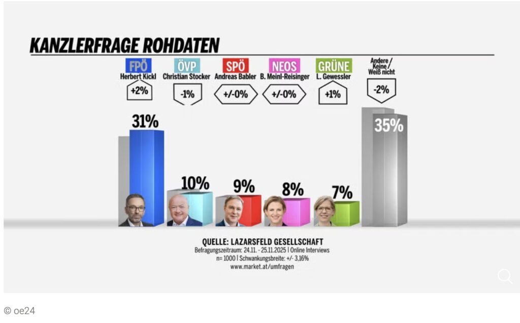 Noch besser sieht es in der Kanzlerfrage aus: Hier konnte Kickl seine Führung auf 31 Prozent steigern, während Christian Stocker nur noch bei zehn, Andreas Babler bei neun, Beate Meinl-Reisinger bei acht und Leonore Gewessler bei sieben Prozent liegen.