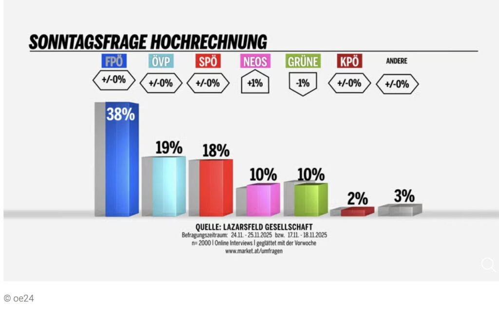 In der jüngsten Lazarsfeld-Umfrage für oe24.at sieht es für die FPÖ weiterhin sensationell gut aus, sie ist mit 38 Prozent mittlerweile die einzige Großpartei in Österreich, alle anderen liegen teils deutlich unter 20 Prozent.