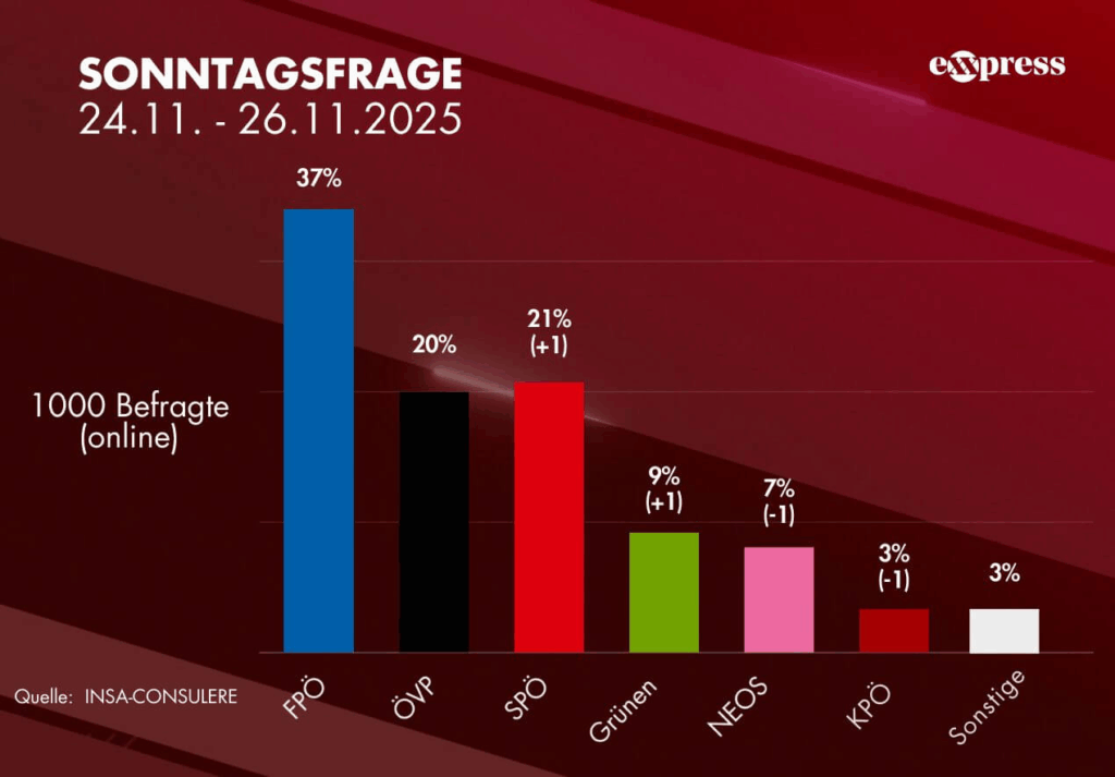 Die aktuelle Sonntagsfrage des Meinungsforschungsinstituts INSA, erhoben für den exxpress, zeigt einmal mehr, wie weit die FPÖ der Konkurrenz voraus ist: Mit 37 Prozent liegen die Blauen unter ihrem Chef Herbert Kickl weit vor allen anderen und festigen ihre Position als klar stärkste Kraft im Land.