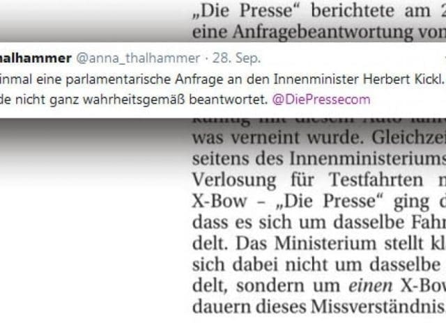 Redakteurin Anna Thalhammer zieht aus dem Umstand, dass die Polizei zehn Fahrtrainings mit einem X-Bow verloste, den falschen Schluss, die Gewinner seien mit dem Fahrzeug der Polizei unterwegs gewesen. Dies hatte der Innenminister in der Anfragebeantwortung ausgeschlossen. Tatsächlich fuhren die Gewinner mit Fahrzeugen, die vom Veranstalter des Events am Red Bull Ring in Spielberg zur Verfügung gestellt wurden – und nicht mit dem Blaulicht-Fahrzeug.
