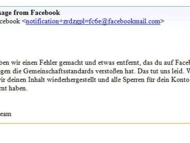 Anscheinend haben wir einen Fehler gemacht und etwas entfernt, das du auf Facebook gepostet hast und das nicht gegen die Gemeinschaftsstandards verstoßen hat. Das tut uns leid. Wir wollten dir mitteilen, dass wir deinen Inhalt wiederhergestellt und alle Sperren für dein Konto aufgrund dieses Versehens entfernt haben.