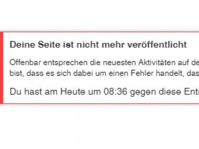 Offenbar entsprechen die neuesten Aktivitäten auf deiner Seite nicht den Nutzungsbedingungen für Facebook-Seiten. Wenn du der Ansicht bist, dass es sich dabei um einen Fehler handelt, dass deine Seite nicht mehr öffentlich ist, kannst du Einspruch erheben.