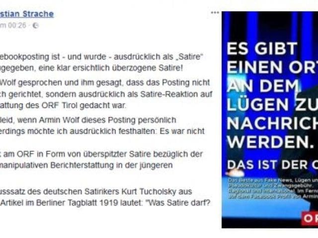 Schossen Kabarettisten in der Kategorie von Dirk Stermann und Christoph Grissemann über das Ziel und machten die Freiheitlichen ihrem Unmut darüber Luft, hieß es postwendend, man solle doch nicht so wehleidig sein. Jetzt ist es einmal umgekehrt passiert: HC Strache ist ein satirisches Posting gelungen, das in seiner Fan-Gemeinde großen Beifall hervorrief. Er schrieb – mit Hinweis, dass es sich um eine Satire handle – auf dem Konterfei des ZIB-2-Moderators Armin Wolf folgendes: