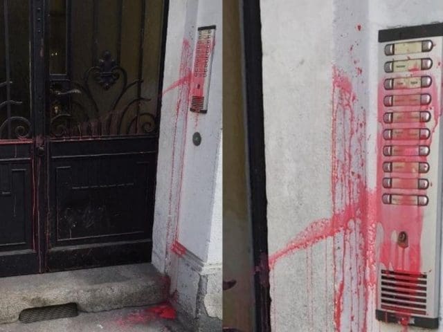 Mit ganz ähnlicher Farbe verunziert ist seit der Nacht auch das Haus der Studentenverbindung „Corps Teutonia“ in der Grazer Klosterwiesgasse, nur etwa zehn Gehminuten vom Congress entfernt. Es wurde im Eingangsbereich mit Farbbeuteln beworfen, die Gegensprechanlage dabei schwer in Mitleidenschaft gezogen.