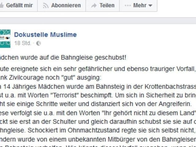 Eine 14-Jährige Moslemin aus Wien wurde nun der offensichtlichen Lüge überführt. Aufgrund ihres Kopftuches – so hieß es in einem Facebook-Posting – sei sie von unbekannten Tätern auf die Gleise der Station Krottenbachstraße der Schnellbahn-Linie S45 in Döbling gestoßen worden. Sie erstattete Anzeige wegen absichtlicher schwerer Körperverletzung, doch die Ermittler sichteten entsprechendes Videomaterial der Station. Die Angaben der "Wienerin" stellten sich als falsch heraus.