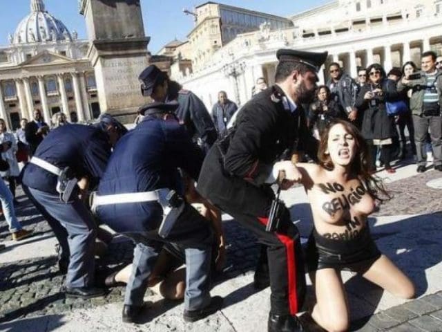 Diese Aktion fand am Nachmittag des 25. Dezembers statt, nachdem Papst Franziskus seinen Segen „Urbi et orbi“ gespendet hatte. Die anwesende Polizei nahm die Feministin unmittelbar nach der Aktion fest.